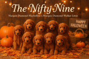 Marquis Diamond Maybelline (PR25688806) × Marquis Diamond Boardwalk (PR21119703) We are thrilled to announce the arrival of The Nifty Nine, a beautiful litter of Red Standard Poodle puppies born Monday, August 25, 2025! These little treasures come in all shades of red — from light to dark. 4 Males 5 Females The puppies will be ready for their new homes starting October 20, 2025 and thereafter. 🐾 Details & Availability Price: $2000 USD Deposit: $500 (to hold your choice in the litter) Deposits are now being accepted – males and females available Each puppy will receive: Age-appropriate parasite control Vaccines…